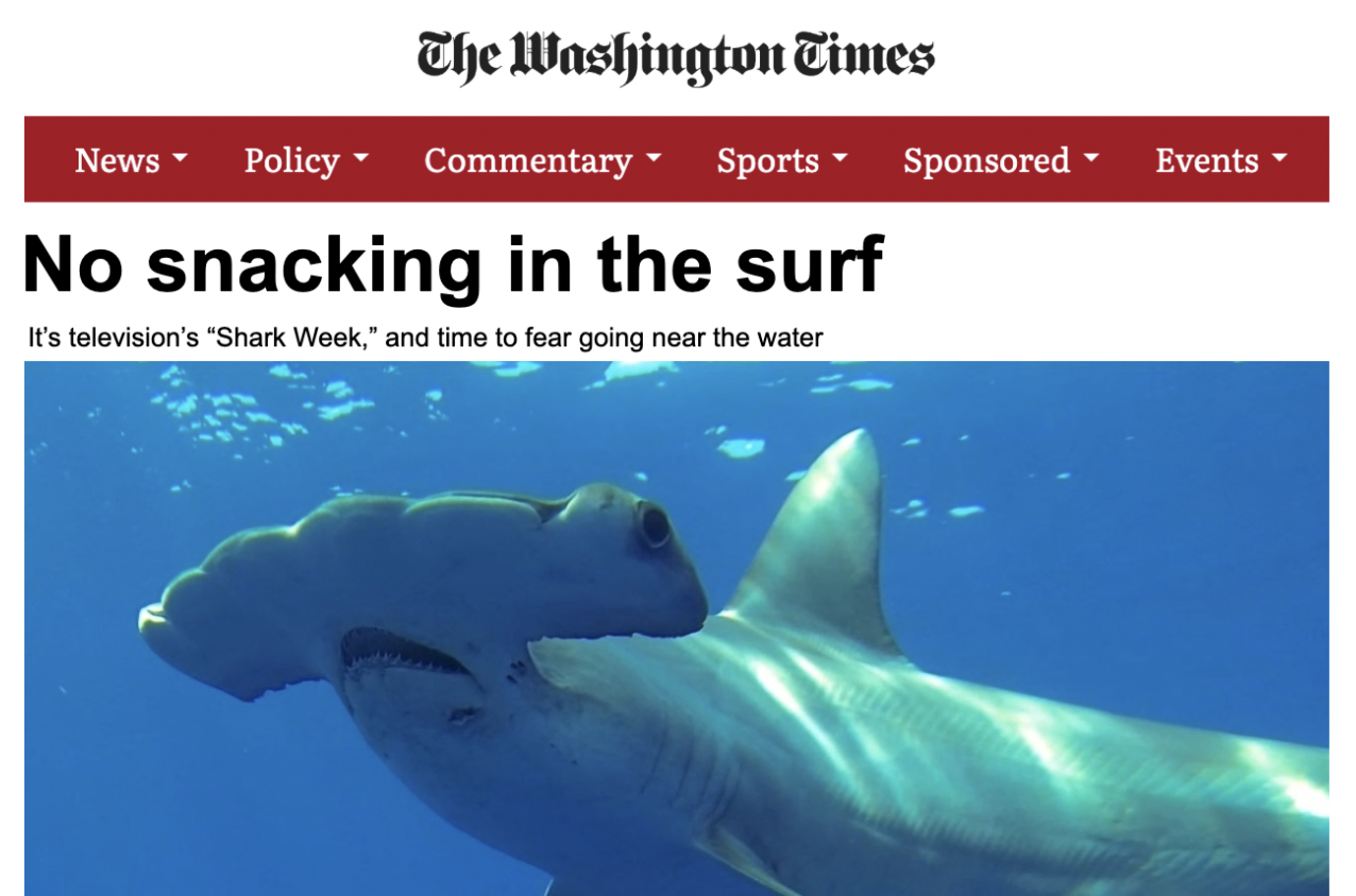 This text is a newspaper editorial about media coverage of sharks during “Shark Week,” commenting on how television and news outlets sensationalize shark attacks and exaggerate the danger sharks pose to humans. It is targeted at readers of The Washington Times, specifically those who follow popular media and current events and may be influenced by dramatic news reporting. The purpose is to criticise the media’s fear‑mongering and encourage readers to adopt a more balanced, rational perspective on sharks and shark attacks. This aim is accomplished through the use of statistics, historical references, irony, sarcasm, exaggerated imagery, and contrast between the rare danger sharks pose to humans and the far greater harm humans cause to sharks. In doing so, the writer also challenges a culture in which fear is used to attract attention and profit.