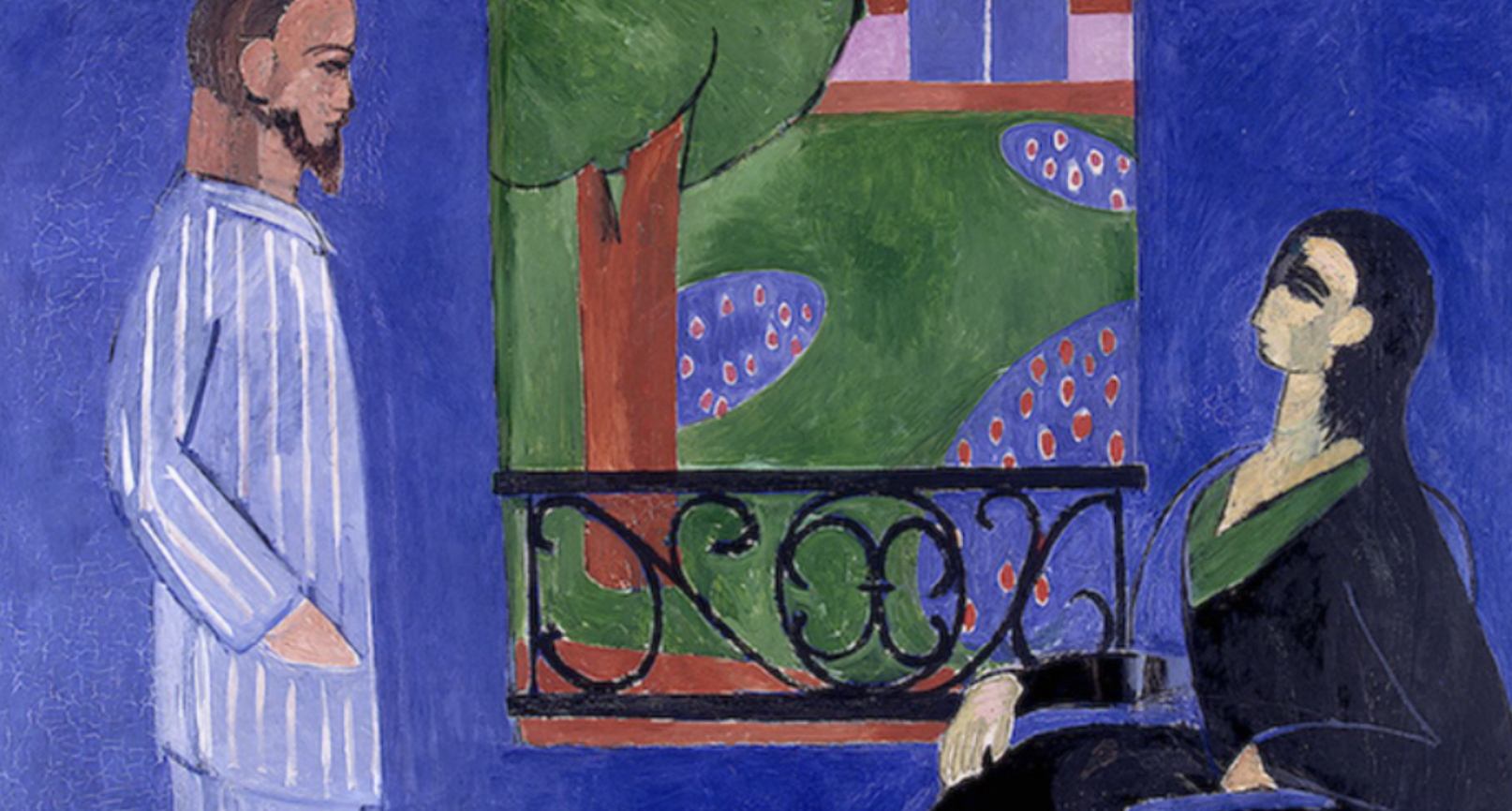 This painting conveys tension and unspoken emotions between two figures, much like the subtext in dialogue.