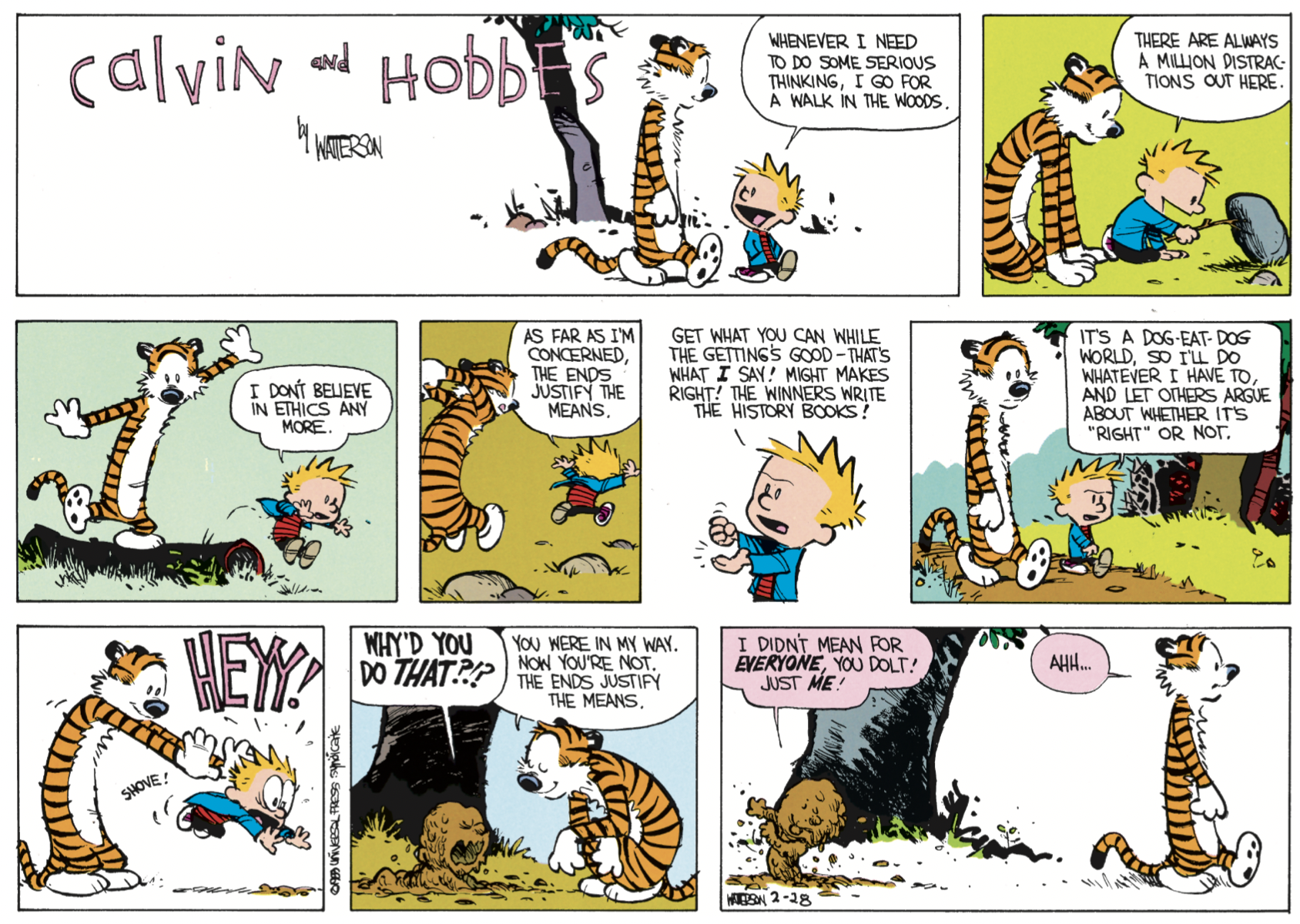 In modern society, where success and competition are often valued over fairness and shared responsibility, young readers seek guidance on how to understand right and wrong in a confusing world. The provided text, a 1989 comic strip titled “Calvin and Hobbes” written by Bill Watterson, aims to persuade a general newspaper audience, particularly young readers, to question selfish moral thinking and reflect on the importance of fairness. The comic strip employs a multifaceted approach. By interplaying irony with step-by-step panel sequencing as well as exaggerated character expression, the text successfully draws the reader in and encourages them to reconsider the belief that “the ends justify the means.”