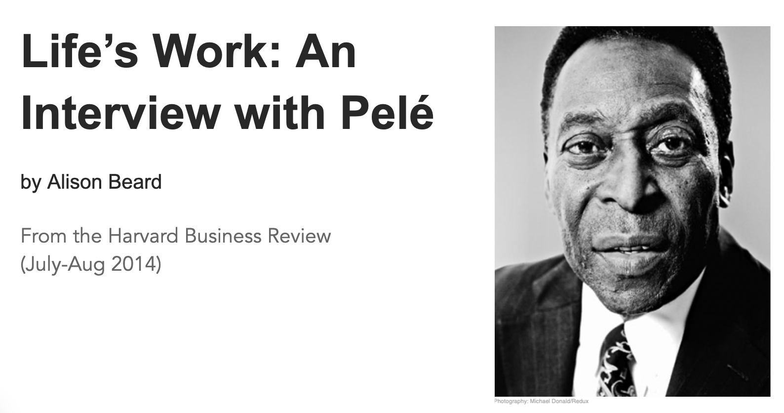 The photograph shapes our understanding of Pelé by presenting him as reflective and dignified rather than as an action‑focused sports star. The close‑up framing draws attention to his face, encouraging readers to focus on his character instead of his physical ability. His direct eye contact creates a sense of honesty and connection, making him seem open and sincere. The fact that he is wearing a suit and tie, rather than sportswear, presents him as professional and statesman‑like, elevating him beyond the identity of an athlete. The black‑and‑white style adds a timeless quality, reinforcing the idea that his legacy extends beyond a single era. In addition, visible signs of age emphasize experience and wisdom, supporting the reflective tone of the interview. The photo presents Pelé as mature, composed, and respected, aligning with the portrayal of him as a thoughtful and enduring public figure.